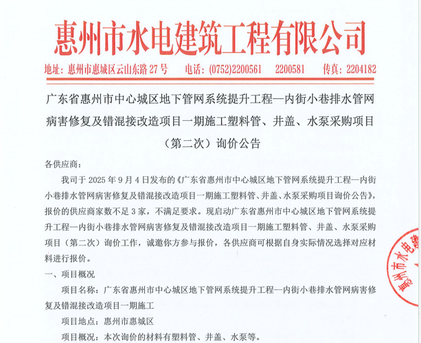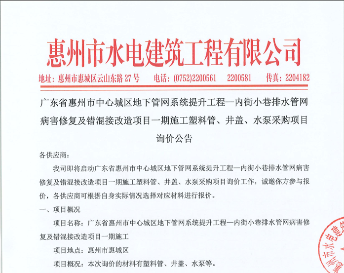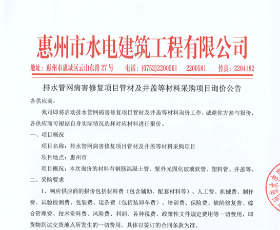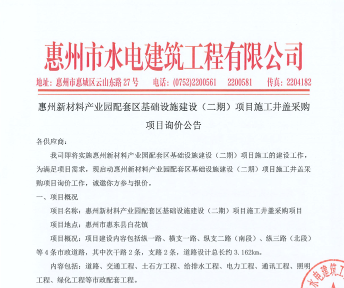 惠州新材料產(chǎn)業(yè)園配套區(qū)基礎(chǔ)設(shè)施建設(shè)(二期)項(xiàng)目施工井蓋采購項(xiàng)目詢價公告……